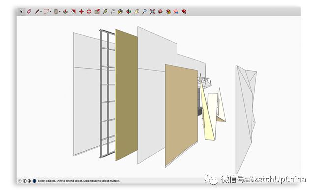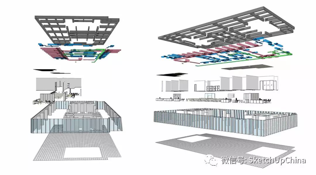 整個工作流程更加緊湊且一目了然。如有有錯誤將會是顯而易見的,“哦,看這裡,這堵牆沒有正確地與門窗豎框連接。”我們可以直觀地看到哪些是具有可建造性的,哪些是失敗的,我們可以及早發現問題。與此同時,花在視覺效果上的時間也減少了很多。我們可以通過 SketchUp 插件快速地從任何角度生成 3D 透視圖,這樣只需要花費幾分鐘時間而不是數個小時。