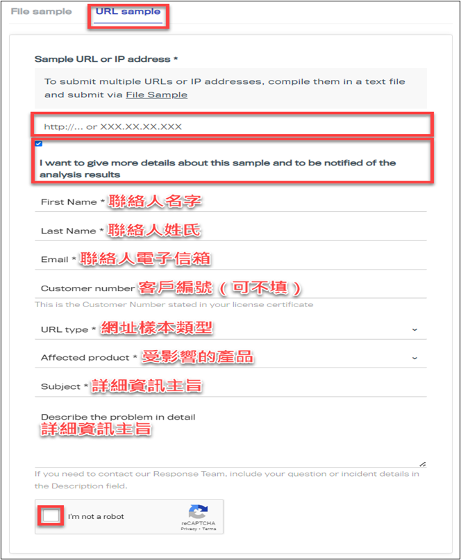- 點擊「I’m not a robot」的白框,再點擊之後出現的「Submit URL sample」,完成檔案樣本的上傳。